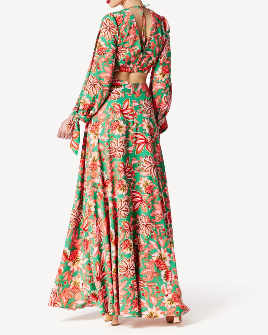 Floral printed maxi dress with “V” opening on the neckline and back.