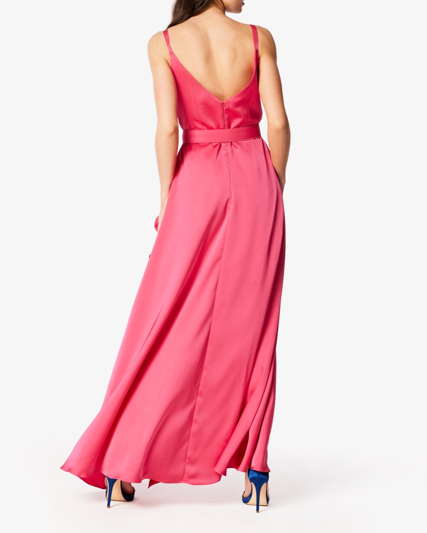 Satin maxi dress with a crotch bodice with a matching belt in the same fabric.