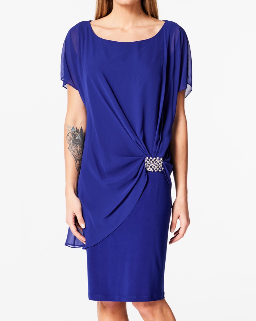 Straight dress in elastic fabric combined with muslin at the top, ideal for a formal look. Detail,strass embellishment on the back